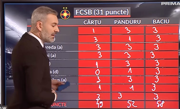 Înainte de prima etapă a anului, la Prima Sport, Cârțu, Panduru și Baciu au fost provocați să dea pronosticuri pentru cele nouă meciuri rămase de disputat, pentru toate pretendentele la play-off. E drept că FCSB a fost ultima și invitații au ajuns acolo un pic obosiți, dar fostul fundaș al Stelei avea ideile foarte clare, după cum vedeți în imagine.