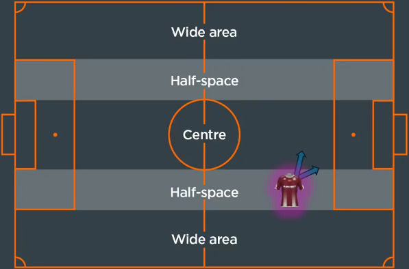 Este Moruțan un decar pur? În opinia mea, nu. E un mijlocaș ofensiv de ultimii 30 de metri, abil pe spații mici, dar care preferă să exploateze ceea ce englezii numesc half-spaces. Explic. Și vă las și o imagine cu care antrenorii sunt familiarizați.